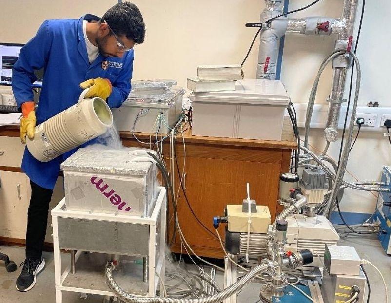The photo shows me cooling down a copper pulse charging coil using liquid nitrogen in preparation for pulse-magnetising a bulk superconductor.”