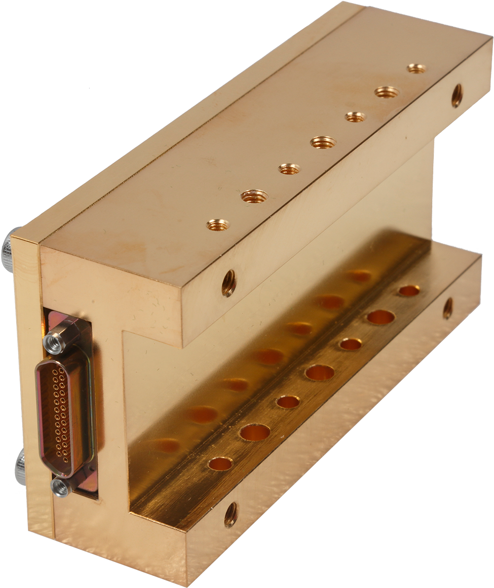 In addition to the screened measurement cable there is a low-pass multi-stage filter can be mounted at cryogenic temperatures down to below 100 mK. This has the ability to filter 24 signal lines with filter options of 4 different cut-off frequencies. The filter is constructed in an Au plated Cu chassis with RF gaskets to provide screening and thermal dumping for the filter PCB. The filter components are carefully selected surface mount components which provide very good value stability over the temperature range from ambient to sub 100 mK.